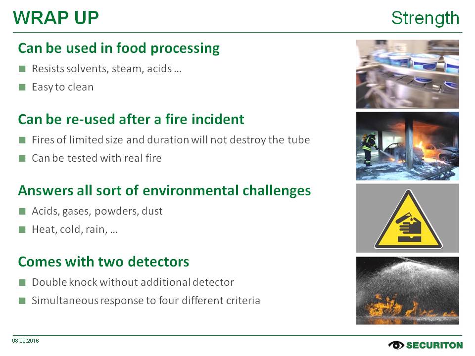 Seja o monitoramento completamente automático de grandes áreas, a resistência a gases corrosivos, extrema umidade e altas temperaturas ou a diferenciação entre alarmes falsos e perigo real; a lista de requisitos para um detector de calor linear de ponta é longa e detalhada.